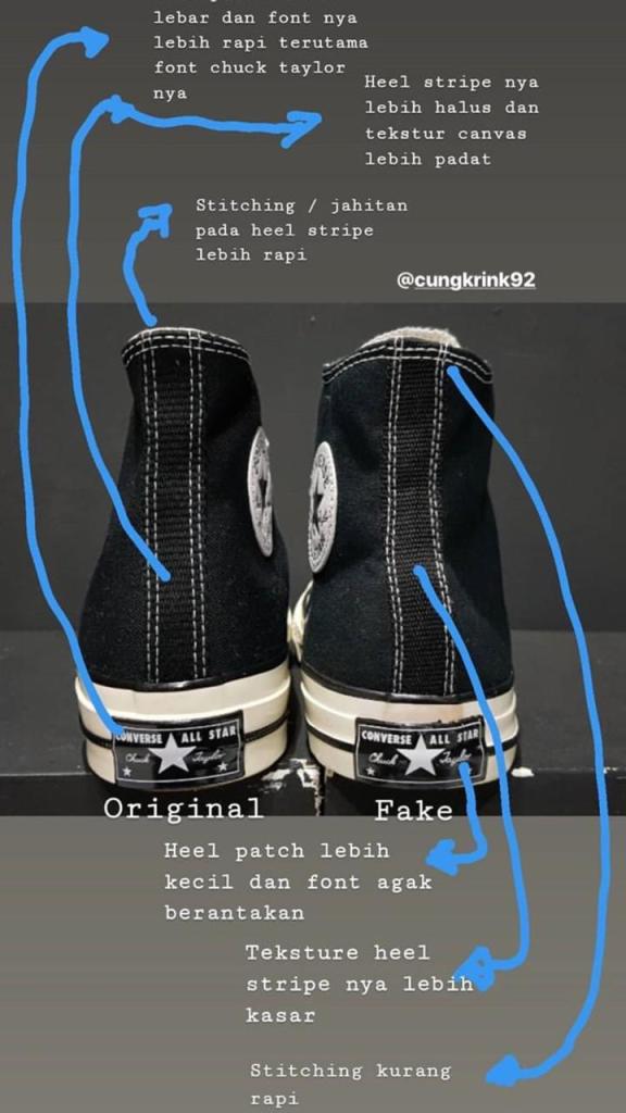 Heltab biasanya dibagian belakang sepatu yang merupakan ciri converse, vans dan lain-lain, bisa dilihat dari sisi kerapihan font heel tab dan kerapihan jaitan pun bisa dilihat. teksture heel stripe pun terlihat kasar.