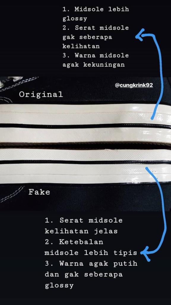 Loh emang midsole ada seratnya ya? loh ya tentu ada tetapi biasanya tidak ditunjukan atau diperlihatkan.. midsole seri 70s itu lebih tebal dari seri basic jadi ketahanannya pun pasti akan lebih lama.. original itu warnanya akan agak kuning/peach dan terdapat glossy atau mengkilap agar membuat kesan bahw sepatu ini mewah.
